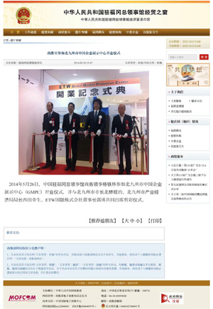 • ETW創(chuàng)始人與中華人民共和國祝福岡總領館領事,以及北九州北橋市長,產(chǎn)業(yè)經(jīng)濟局西田局長,在“ETW日本展館GMPC”開館儀式剪彩! 圖片鏈接